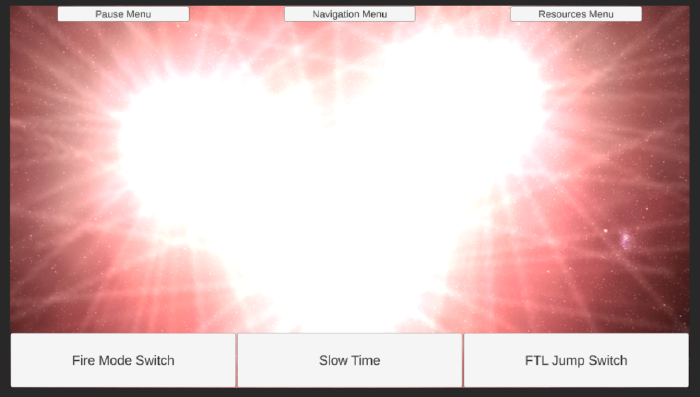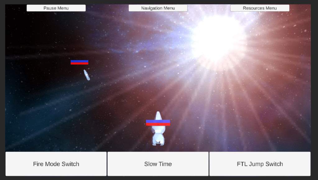 First of all, I’ve continued work on the jump system. As I mentioned in my earlier Dev Log 5 post, this works by having every player ship disappear (in practice, they get scaled down to 0 and get removed from any enemies’ targeting, then get scaled back up after the jump). Now, the jump actually does something – it spawns a lens flare as a visual effect to cover up the ship disappearing, and it triggers a game manager method to change the level environment. For now, all that method does is change the skybox, but in the future it will despawn enemies and environmental objects and spawn in new ones, accompanied by an encounter text box.