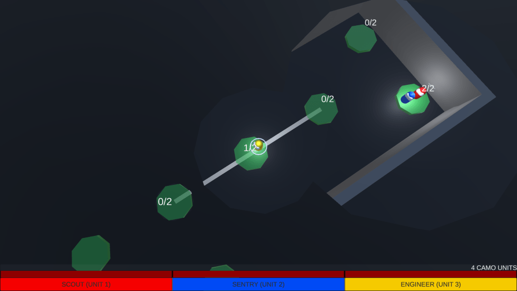 - I implemented the game UI, node-based movement system, camera controls, character switching system, fog of war system, the scout’s “danger node detecting vision,” the engineer’s “smoke bomb/camouflage field” mechanic, the damage sphere used for enemy attacks, and in-game sound effects.